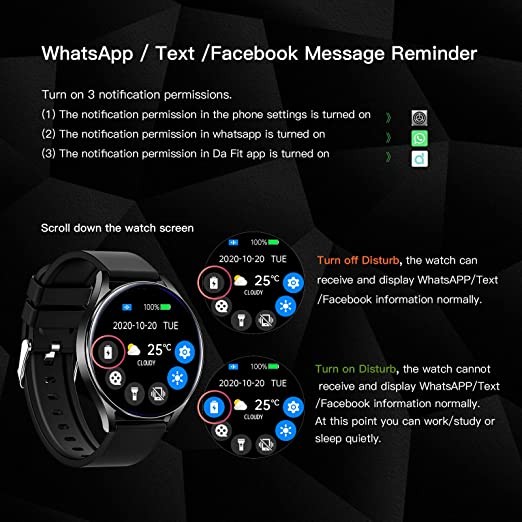 【APP/SMS Reminder】Before using the smart watch, please enable 3 kinds of notification permissions: (1) Open the notification permission set by the mobile phone. (2) Turn on the notification permission of communication applications such as Whatsapp. (3) Turn on the notification permission in the Da Fit app. Note: The smart watch can only receive and display APP messages and SMS notification reminders, and cannot directly reply to APP messages/text messages. Turn off DISTURB mode.